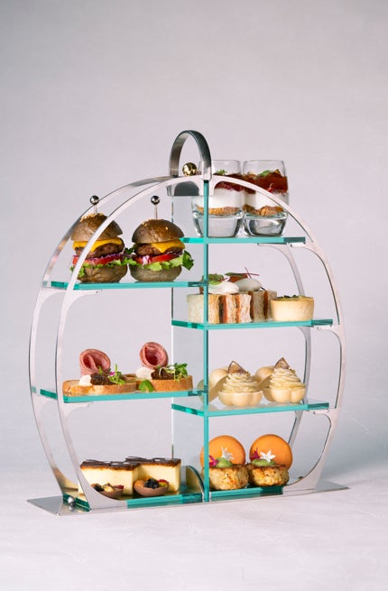 1日9組限定のスペシャルアフタヌーンティーは、通常のメニューに「シュリンプのサラダ キャビア添え クリスピーパイと奈良椎茸のデュクセル」 「奈良県産月ヶ瀬の梅ムース」の2品を加え、グリフィンの特製3段スタンドにてご提供いたします。