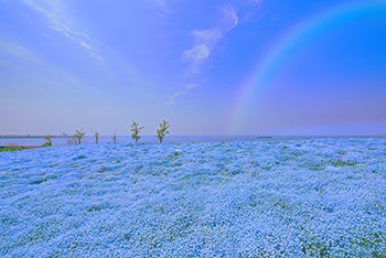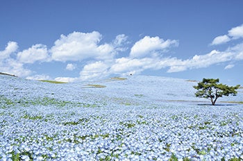 大阪湾を一望できる広大な敷地にネモフィラ畑が広がり、視界一面が淡いブルーに包まれる。園内には約100万株のネモフィラが植えられ、空が茜色に染まる夕景もロマンチック。同じく春に見頃を迎えるチューリップや桜とネモフィラのコラボゾーンも人気。