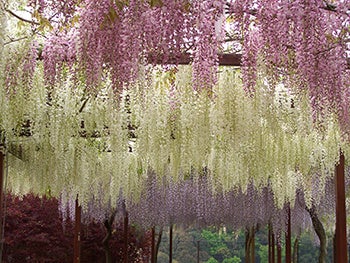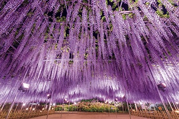 四季折々の花が楽しめる中でも、春は藤の花が圧巻。600畳敷きの藤棚には樹齢160年を超える大藤が。そのほかにも、きばな藤や白藤のトンネルなど、350本以上の藤が優雅に咲き誇る。薄紅、紫、白、黄の順で開花するため花期が長いのが特徴。
