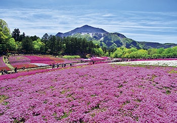 植栽面積は1万7600平方メートルと、関東有数の規模を誇る羊山公園の芝桜。10品種40万株以上が植えられ、波打つようなデザインが特徴。一面に咲き誇る芝桜のじゅうたんは秩父のシンボル武甲山を背景に撮影するのがオススメ。