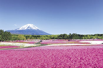 富士山麓に広がる1.5haの敷地に、ピンク、赤、紫、白などの色鮮やかな芝桜が一面をじゅうたんのように埋めつくす。残雪が美しい富士山とかれんな芝桜との競演は抜群の美しさ。4月中旬から「富士芝桜まつり」が開催される。