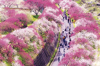 紅、白、ピンクと3色の見事なグラデーションが立ち並ぶ花桃の里。花桃は鑑賞するための桃のことで、ここでは3色に咲き分ける「三色花桃」約5000本が、愛らしいグラデーションと圧巻の景色を作り出している。