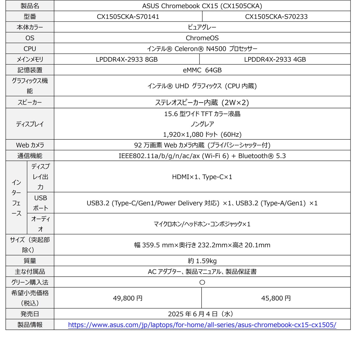 「ASUS Chromebook CX15 (CX1505CKA) 」は、2025年6月4 (水) より発売を開始します。