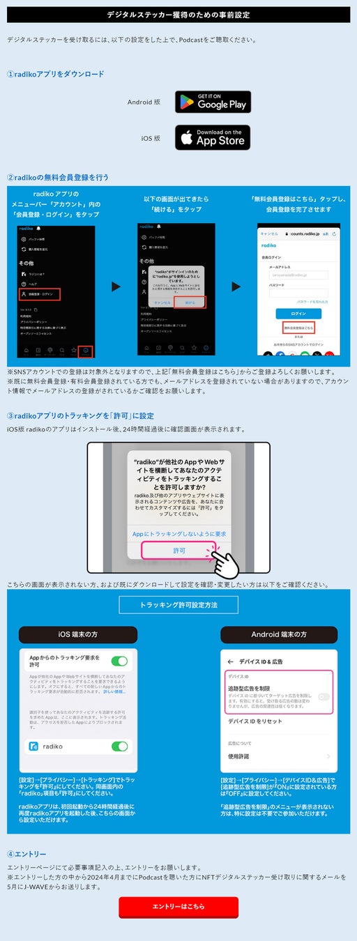 本施策は、事前にスマートフォンの設定を行い、特設ページよりエントリー登録を行ったうえで、radikoでPodcast番組を聴取する必要があります。radikoの聴取ログからPodcastを聴いたリスナーを抽出し、NFTデジタルステッカーを配布します。このNFTを認証キーとして、特別Podcastエピソードにアクセスできるようになります。