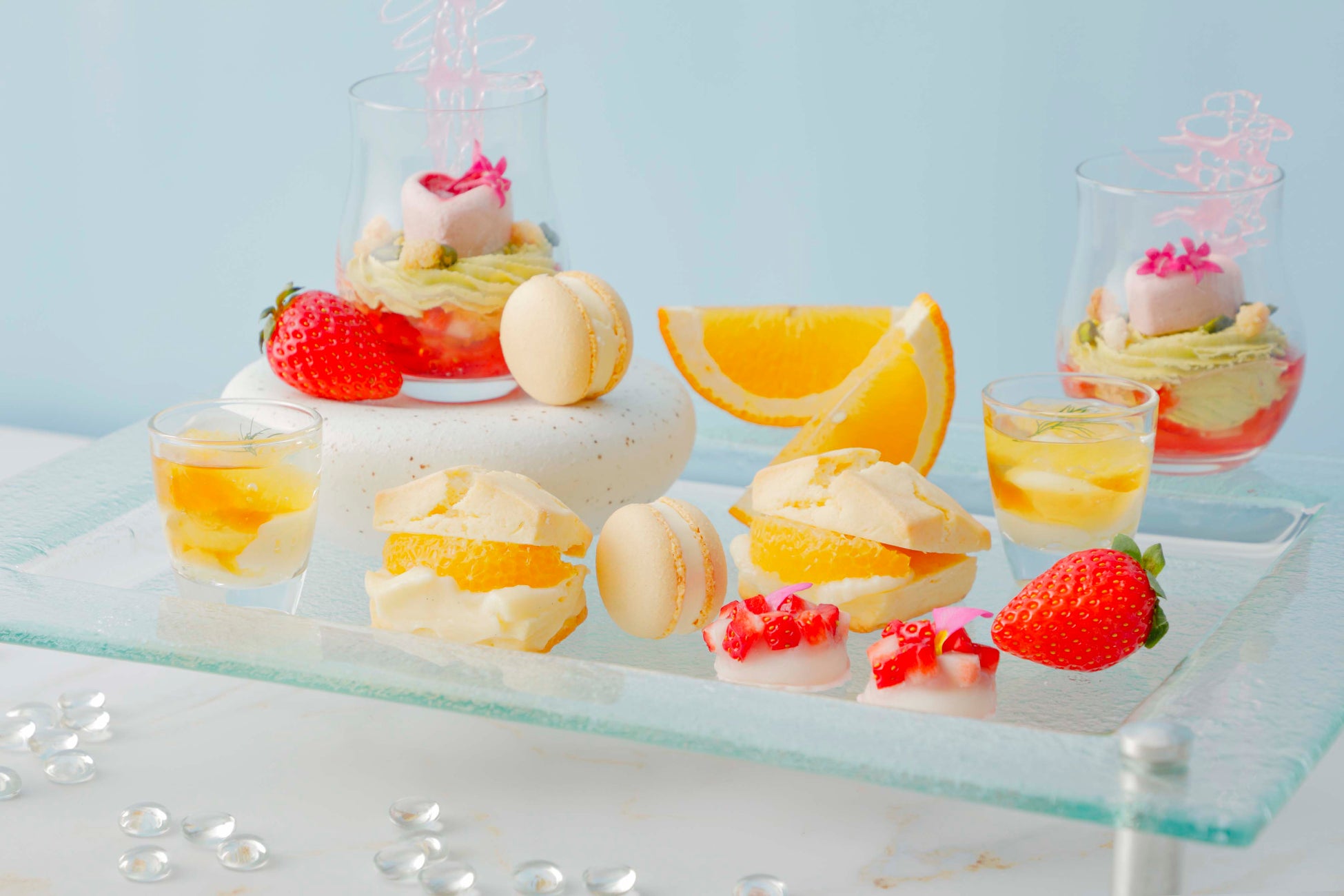 春らしい色鮮やかさを基調に、和歌山県オリジナル品種の苺「まりひめ」や柑橘、様々な春野菜をあしらった、見た目にも可愛らしいイブニングハイティー付きの宿泊プランです。ミモザ仕立てにした菜花と鰆のミ・キュイや、和歌山県産のクエと香草を合わせたクルートを含む6種に、程良い酸味のまりひめと濃厚なピスタチオクリームを合わせたヴェリーヌや、甘夏のスコーンサンドなど、スイーツ5種が並びます。さらに、本プラン限定のウェルカムドリンクとして有田みかんジュースをベースにした「オリエンタルネーブル」をご用意。カクテルまたはモクテルとしてご提供いたします。春の和歌山の食の魅力をお楽しみいただけるイブニングハイティーで、特別な夜のひとときをお過ごしください。