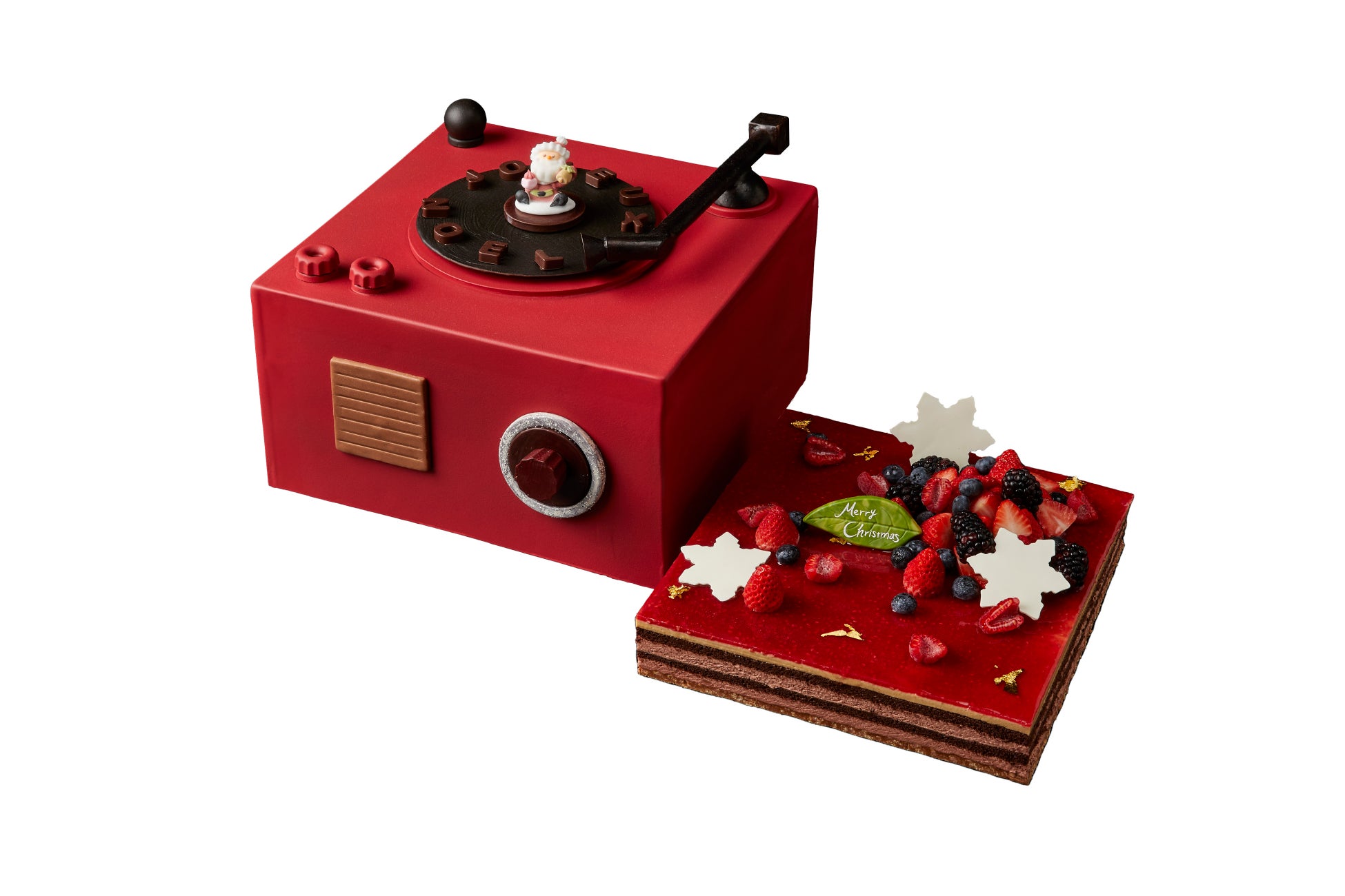 毎年、そのユニークなデザインが話題を呼ぶ数量限定ケーキの今年のモチーフは、今にも愉快なクリスマスソングが聞こえてきそうなレコードプレーヤーです。チョコレート細工の中には、ラズベリームースとビスキュイサッシャーを何層にも重ねました。甘酸っぱいラズベリーと濃厚なチョコレートにアーモンド風味のムースを重ねることで、甘みと苦み、酸味の絶妙なバランスをお愉しみいただけます。