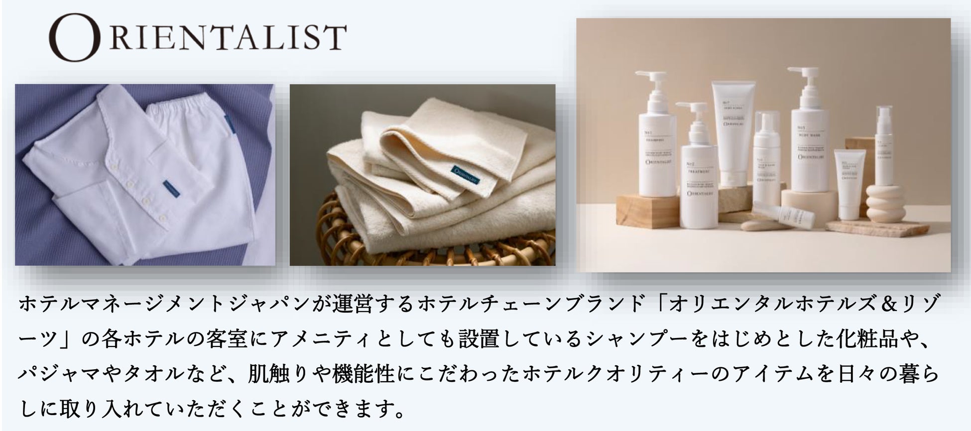 「ORIENTAL MARKET」では、『五感で愉しむ、上質なひととき』というコンセプトのもと、ホテルアメニティを扱うブランド「ORIENTALIST(オリエンタリスト)」、 “コ・クリエーション(地域共創)”の取り組みの一環で立ち上げたアパレル・雑貨ブランド「ORIENTUM(オリエンタム)」、ホテルならではの確かな味わいをお届けする「ORIENTAL TABLE(オリエンタルテーブル)」の3ブランドの良質なアイテムを取り揃えています。