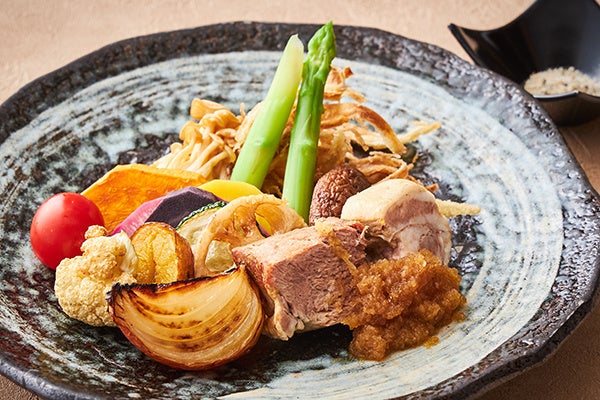 1年を通して温暖な気候で日照時間も長く、海のミネラルを豊富に含む土壌にも恵まれた、たまねぎ栽培に適した淡路島で育てられた「淡路島玉ねぎ」は、時間をかけて栽培するため、栄養分をしっかり貯えています。収穫後、長期にわたり乾燥させることで糖度も増し、炭火で焼き上げてさらに甘さを引き立てました。香ばしく焼き上げられた玉ねぎの炭火の香り、とろとろ食感、甘くて深みのある味わいをぜひお楽しみください。また、山形県の銘柄豚「天元豚」はさっぱりした甘みのある脂、柔らかい肉質、強い旨みが特長です。塩茹でした天元豚に、生姜の風味豊かな特製ダレを絡めます。ジューシーでコクがある天元豚とキリッとした味わいの生姜が相性抜群な逸品を、「淡路島玉ねぎ」の他、旬の彩り野菜と合わせてご堪能ください。