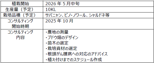 北海道上川郡美瑛町にある「美瑛ファーム」に隣接するワイナリーの設立にあたり、2025年10月よりヴィンヤード造りに関するコンサルティングを開始しました。本件は、メルシャンの「コンサルティング事業」において、苗木の選定や植栽といった初期段階から関与する初の事例です。本取り組みでは、メルシャンがこれまで培ってきたブドウ栽培やワイン造りに関する知見を活かし、畑づくりから醸造設備の検討、運営体制の構築に至るまで、ワイナリーの立ち上げに必要な検討を総合的に支援しています。