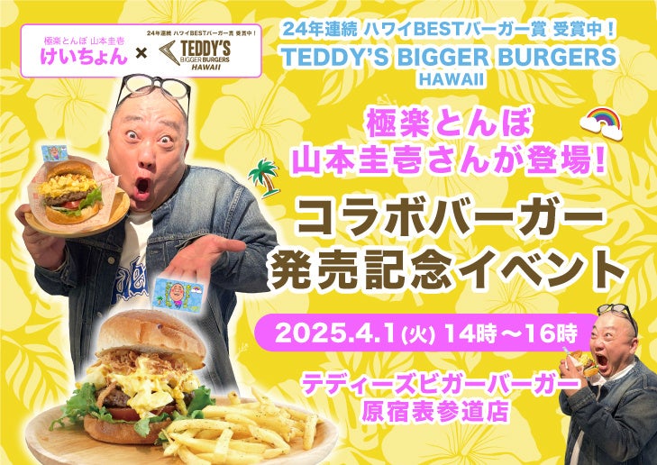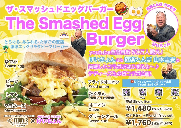 ハワイで24年連続『ハワイBESTバーガー賞』受賞中の人気のバーガーチェーン「テディーズビガーバーガー」では、2025年4月1日より、「けいちょん」こと極楽とんぼの山本圭壱さんプロデュースによるコラボバーガー「ザ・スマッシュドエッグバーガー」を発売いたします。
