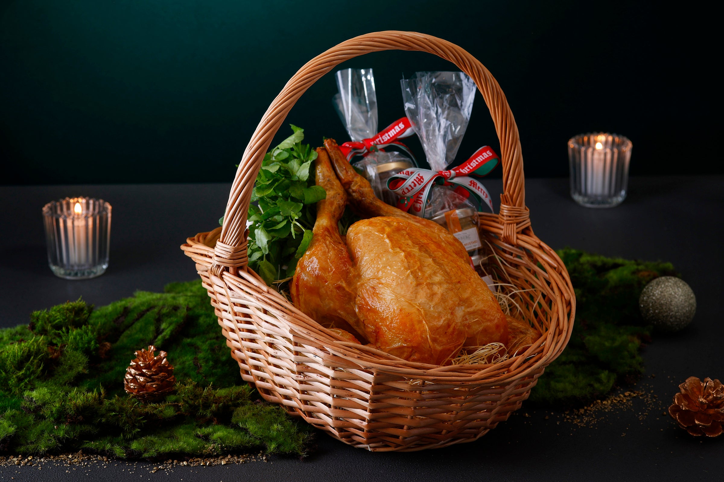 ホテルメイドの本格的なローストチキンをお手軽に楽しんでいただきたいというシェフの思いから生まれたローストチキンとソースのセットです。ストレスフリーの環境でのびのびと健康的に育った千葉県産の平飼い「錦爽とり」を使用。ホテル内で丁寧に時間をかけて焼き上げます。身の引き締まった味わい深いチキンによくあう、定番のグレービーソースと2種類のマスタードを添えてご提供いたします。