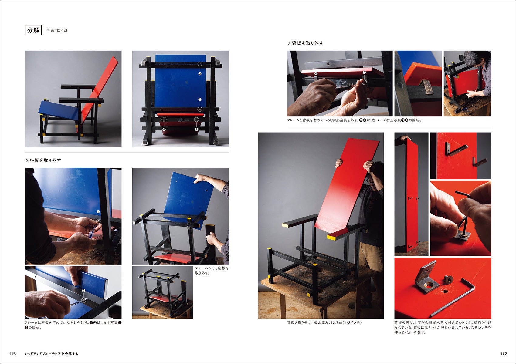 レッドアンドブルーチェアやトーネットNo.14など「名作椅子」と呼ばれている椅子、フィン・ユールやイームズなどの著名デザイナーがデザインした椅子について、解体(分解)、組立、座の張り替えなどの工程を写真入りで詳細に紹介(*椅子によって、解体のみ、解体・組立、布(革)張りの剥がし 等々のパターンあり)。