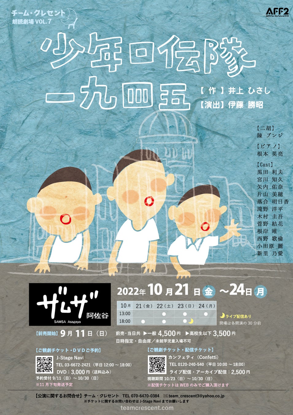一般社団法人 チーム・クレセント主催、チーム・クレセント朗読劇場VOL.7『少年口伝隊一九四五』が2022年10月21日 (金) ~2022年10月24日 (月)にザムザ阿佐ヶ谷(東京都杉並区阿佐谷北2丁目12-21 ラピュタビル B1F)にて上演されます。