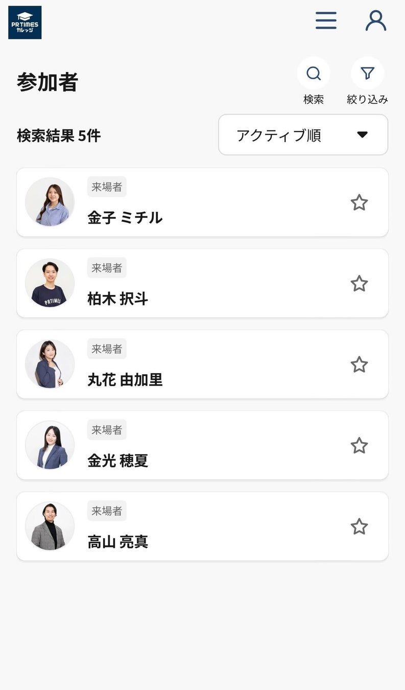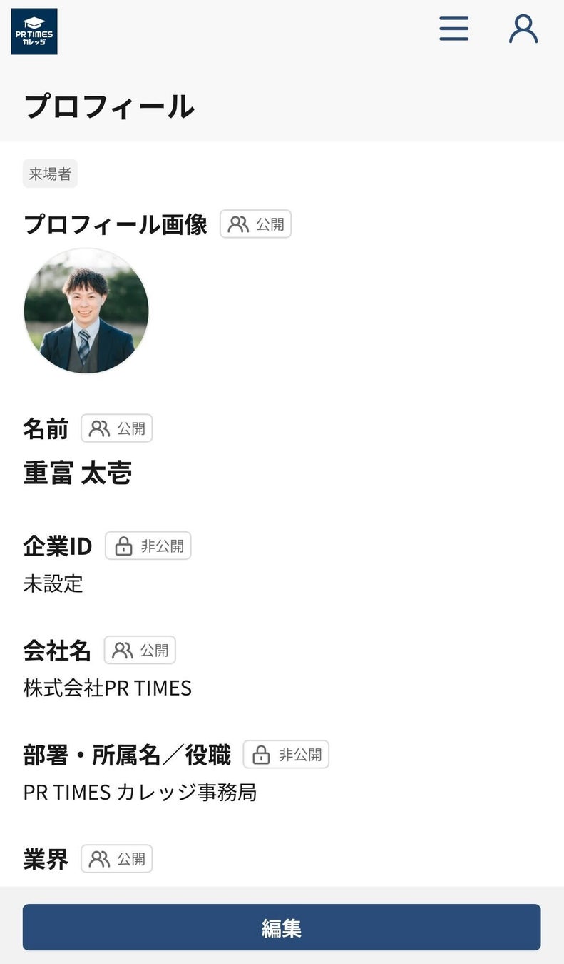 ご自身のプロフィールを設定いただくと、PR TIMESカレッジ開催前から参加者同士の交流が可能です。業界・業種などの基本項目に加えて、今抱えている課題やこれまでの経験を登録いただくことで、共通項の多い方とつながることができます。なお、企業ID、部署名や役職などは非公開情報です。(※プロフィール自体の公開も任意)