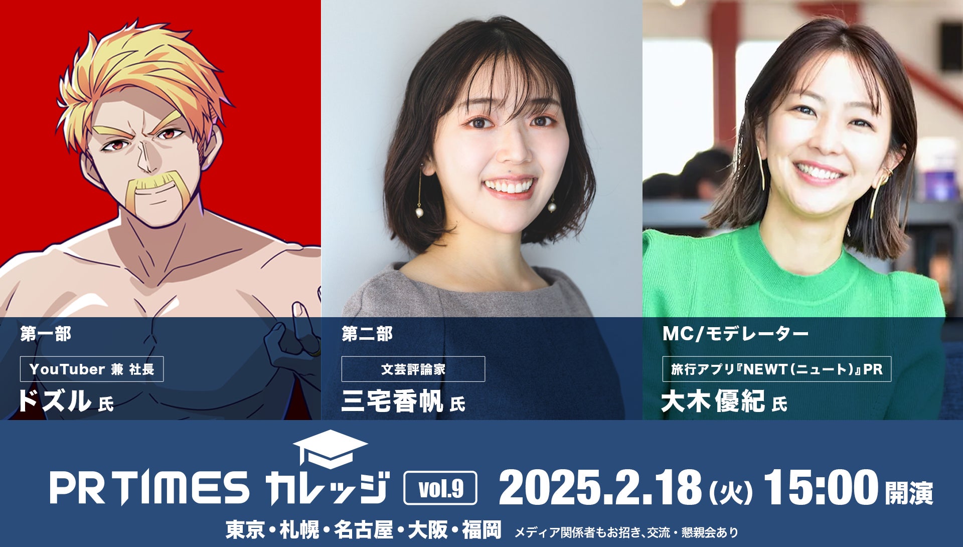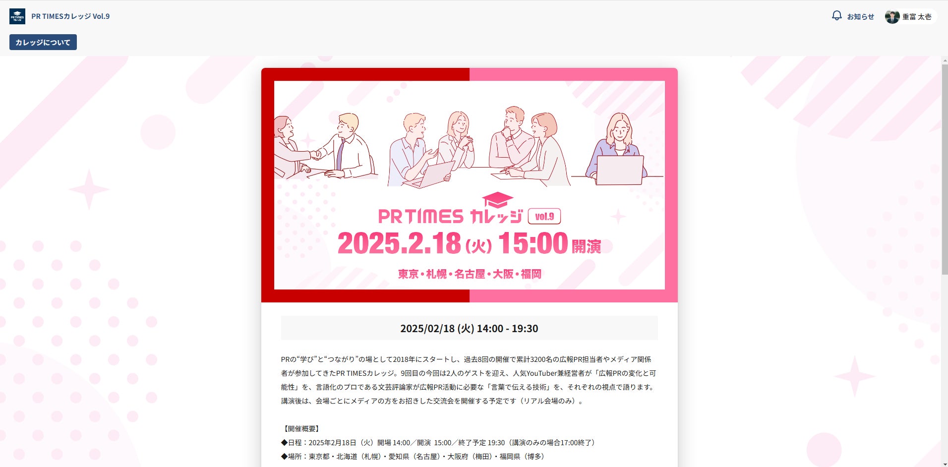 株式会社PR TIMES(本社:東京都港区、代表取締役:山口 拓己、東証プライム:3922)は、2025年2月18日(火)に開催する広報PR担当者向け学びとつながりのコミュニティイベント「PR TIMES カレッジVol.9」の当日コンテンツの詳細を決定し、第2次お申し込み受付を本日1月20日(月)より開始いたしました。また、参加者同士がイベント前後も交流できるオンラインスペースを初めて開設します。交流会だけでなく、同じ悩みを持つ仲間に相談できる場として、ぜひご活用ください(登録は任意)。
