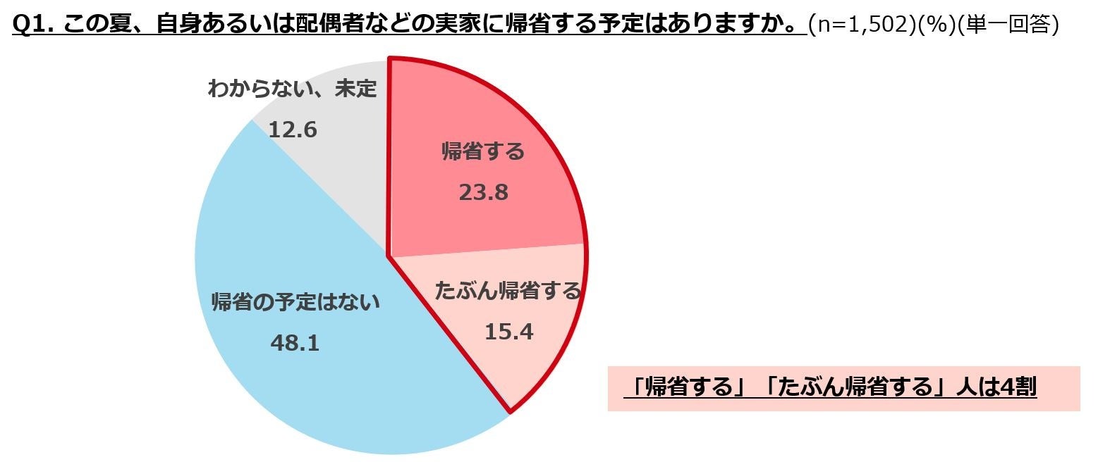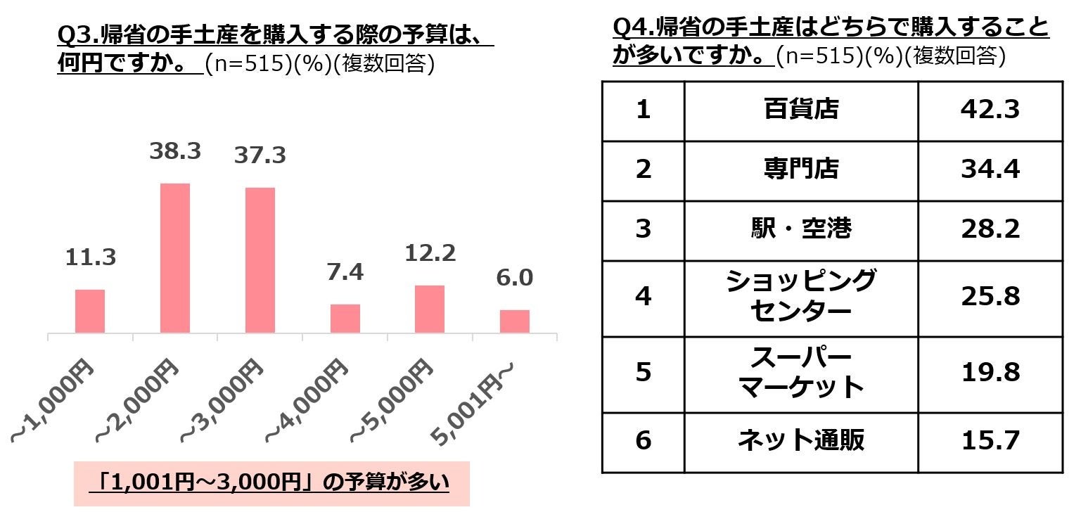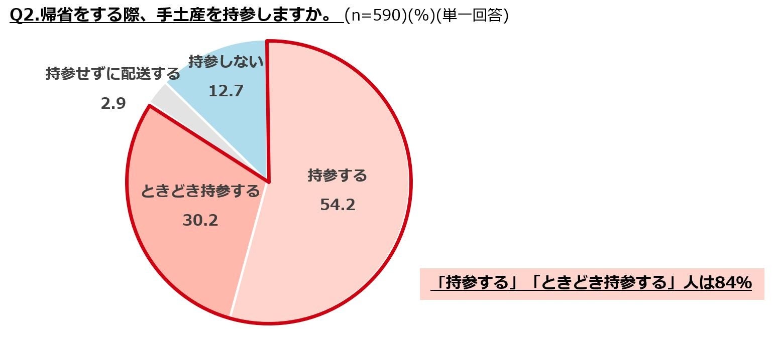 今回の調査によると、「自身、あるいは配偶者などの実家に帰省する予定がある」と回答した人は約4割でした。その内「帰省をする際、手土産を持参する」、「ときどき持参する」と回答した人は84.4%となり、多くの人が手土産を持参する意向があることがわかりました。