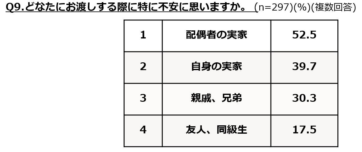 しかし、手土産を渡す際に「喜んでもらえるか不安になる」と回答した人は6割弱に上り、その内の半数以上が具体的な相手として配偶者の実家を挙げました。