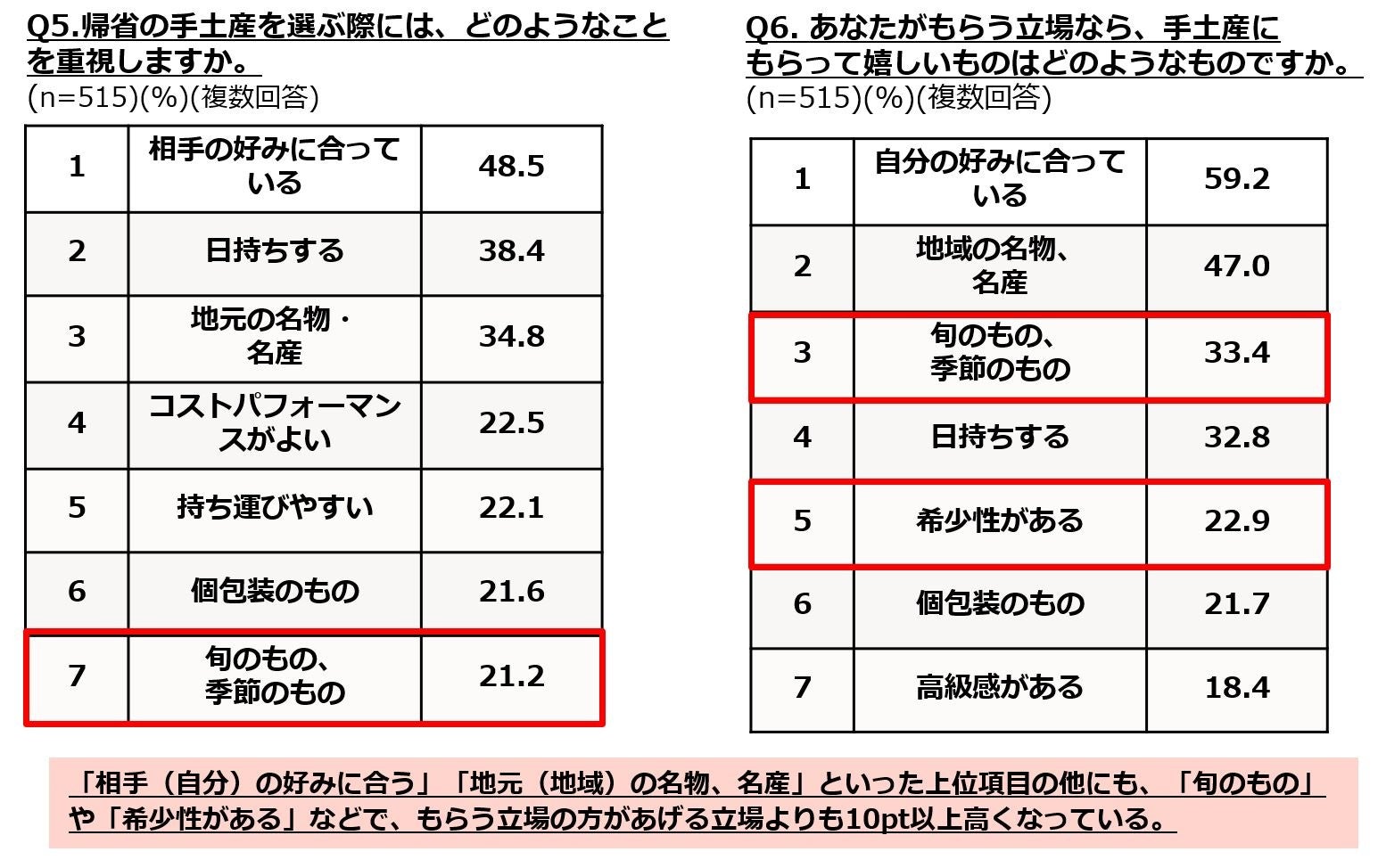 ④手土産に重視することでは「好みに合う」「地域の名物、名産」といった上位項目の他に、「旬」や「希少性」などでも、あげる立場ともらう立場で差が見られる。