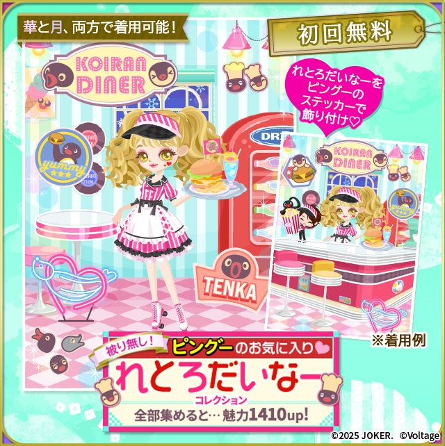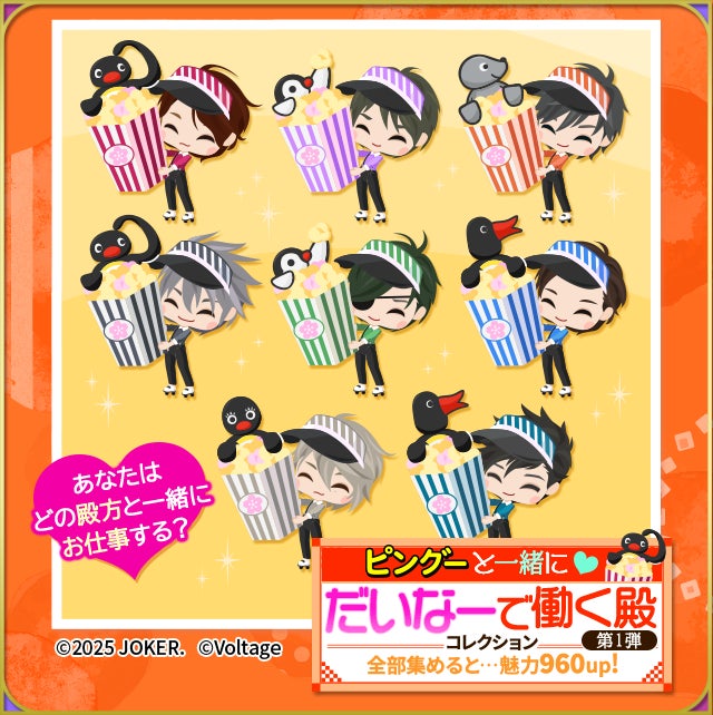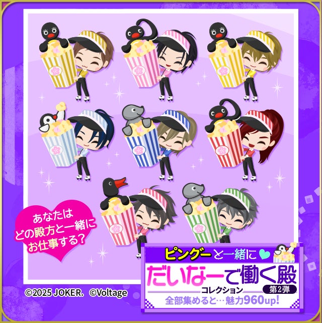 「恋乱LB」華の章、月の章で、全4つのコラボガチャを実施いたします。ピングーのポップコーンを持った殿方が手に入る「ピングーと一緒に♡だいなーで働く殿コレクション」と、「恋乱LB」華の章、月の章のどちらでも使用可能なレトロダイナーの雰囲気が楽しめる「ピングーのお気に入り♡れとろだいなーコレクション」にぜひご注目ください。