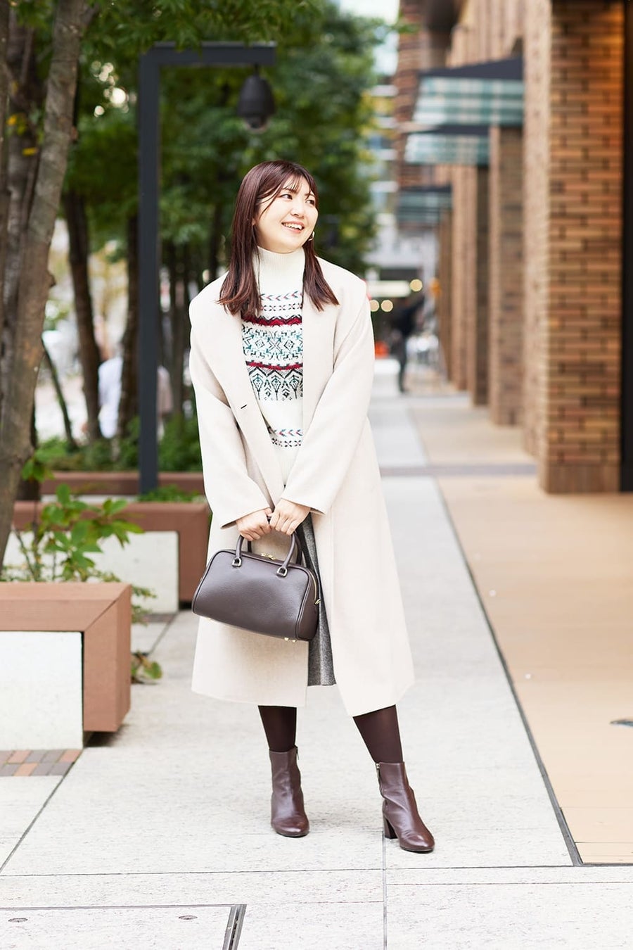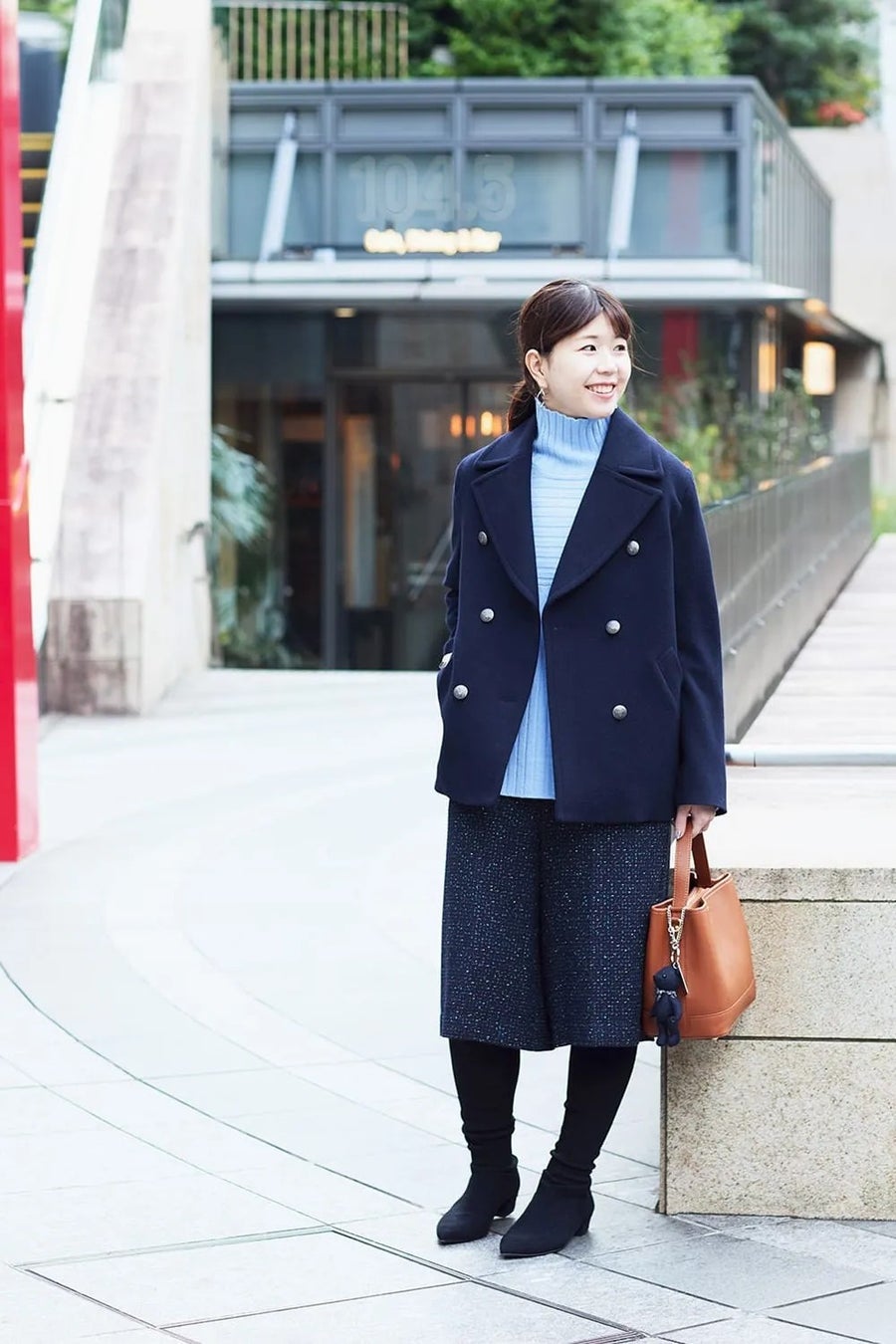 透明感を添えるサックスブルーは、冬の澄んだ空気と相性抜群。 トラディショナルなピーコートスタイルに、さりげなく旬のムードを呼び込んでくれます。 ボトムには、カラフルなミックスツイードのキュロットパンツをセレクト。 表情豊かな素材感が、色ニットとのスタイリングを自然とまとめてくれる万能アイテムです。 バッグのハンドルにはキュートなベアチャームを添えて、ホリデーシーズンらしい遊び心をひとさじ。