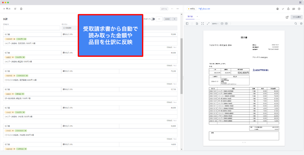 今回の機能により、「freee支出管理 受取請求書」でメールや専用Webサイト、スキャン代行、外部ストレージ連携で請求書を受け取ると、1枚の請求書に対し複数明細行の明細内容(項目、単価、数量、金額)をAI-OCRが自動で読み取り明細仕訳を一括で入力し仕訳入力することが可能です。