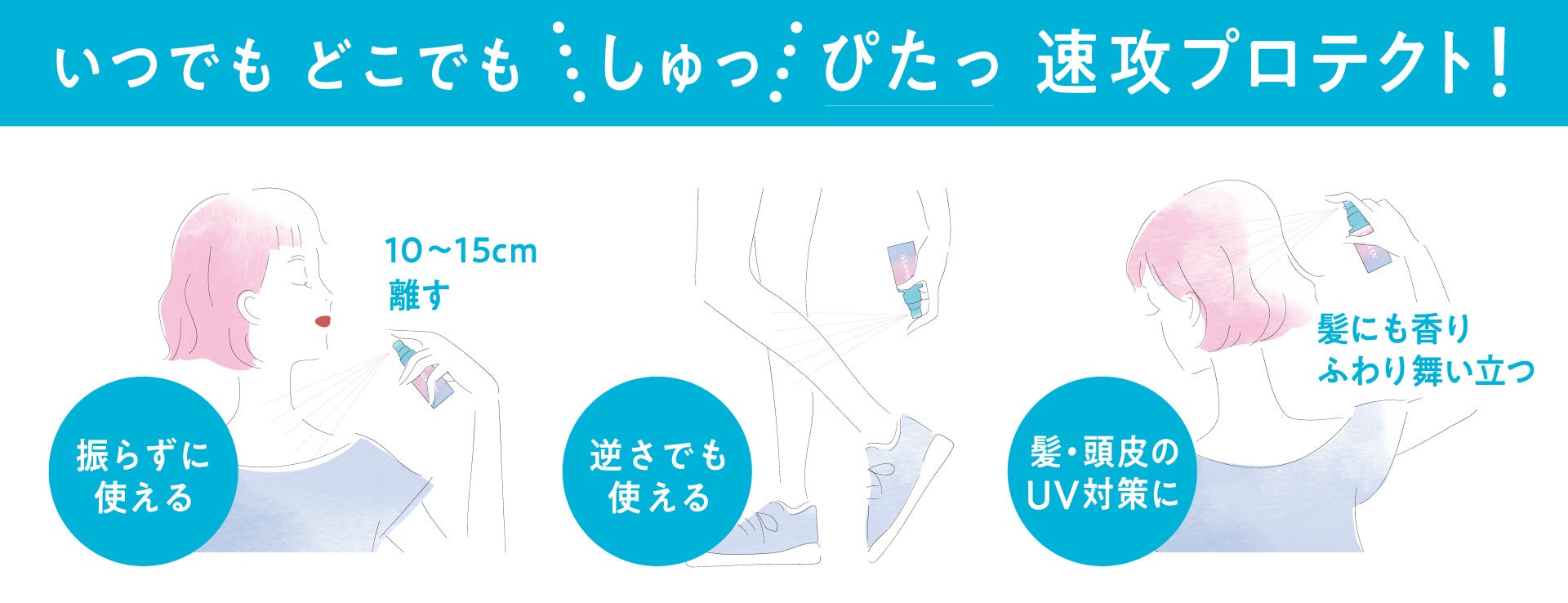 さらに、“髪にも使える”というミストタイプならではの特長を生かし、心地よい香りで髪・頭皮のUV対策をより一層促進します。