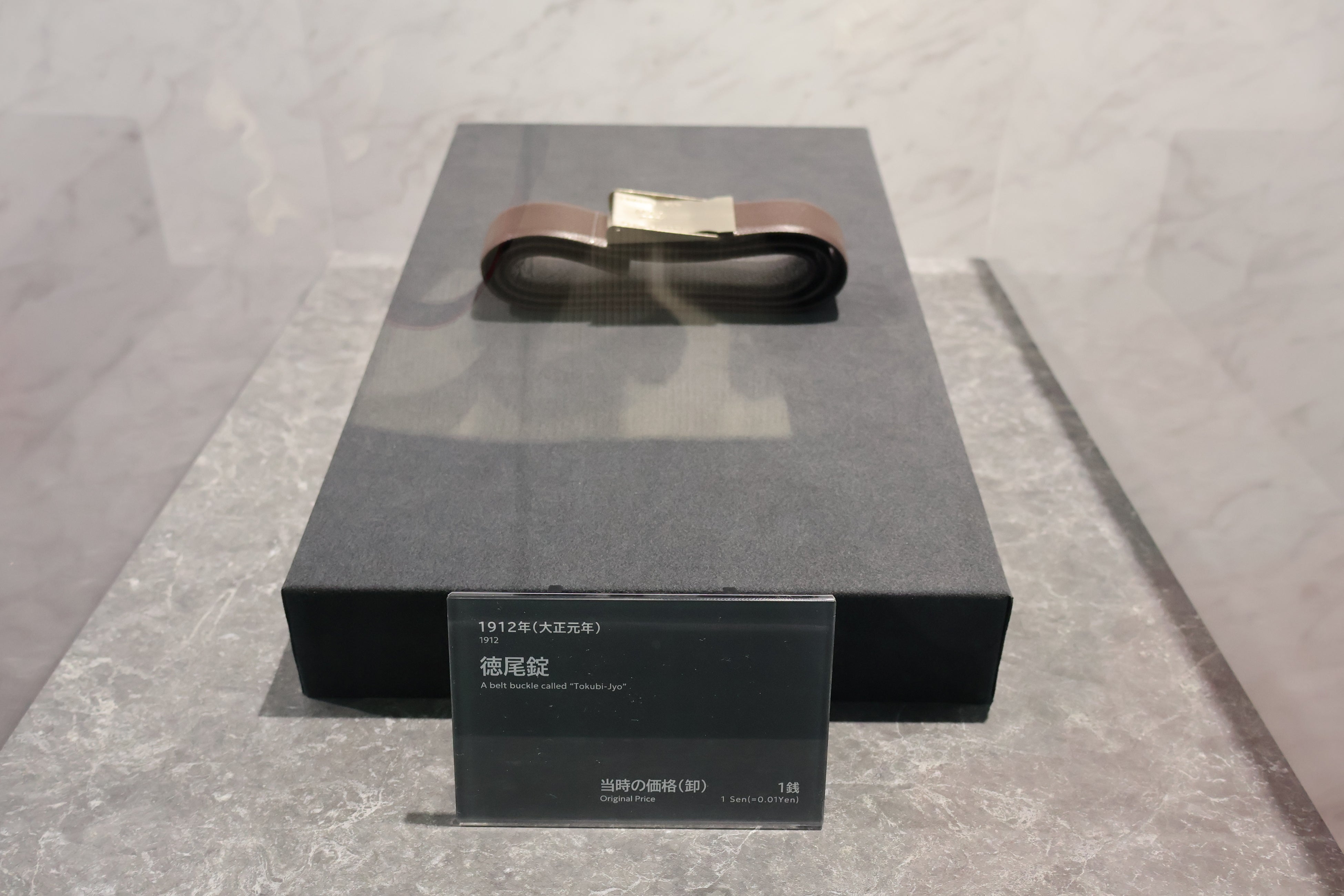 穴がなくても長短自在に締められるスマートなベルトのバックルです。映画で見た登場人物のベルトの先がだらしなく垂れているのが気になり、考案。「徳尾錠」と名付けて、新案特許を取得しました。このバックルでの大量受注をきっかけに、創業者 早川徳次が独立開業しました。