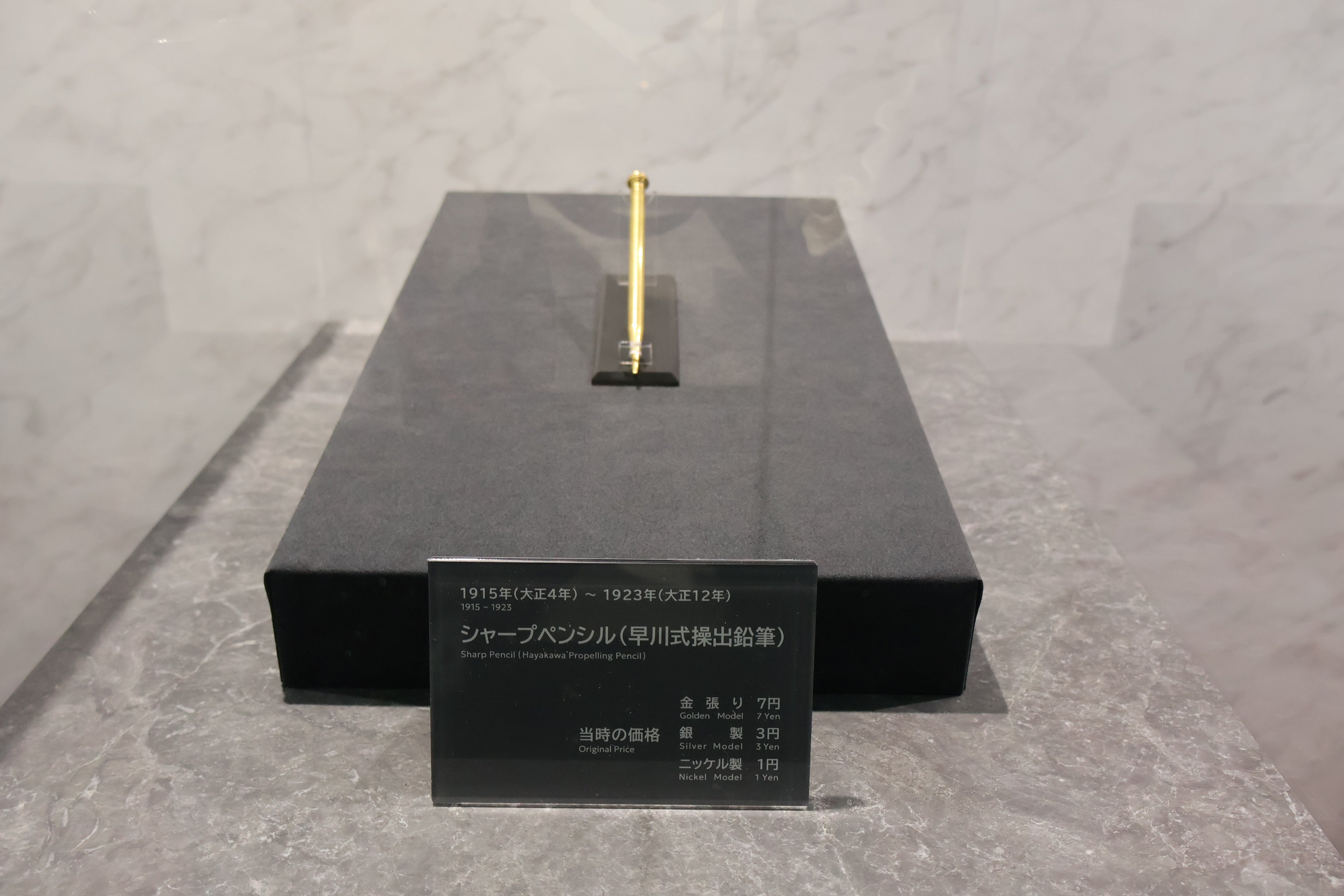 1階のエントランスには、創業者 早川徳次の銅像とともに、当社の礎を築いた「徳尾錠」「早川式繰出鉛筆」を展示しています。