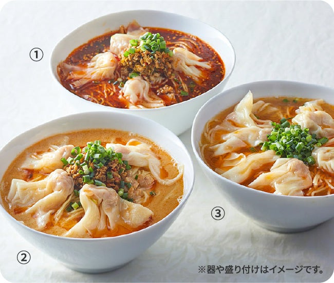 ①辣香海老ワンタン麺(ピリ辛)1,430円 ②海老白胡麻担々麺1,430円 ③海老ワンタン麺(醤油味)1,320円