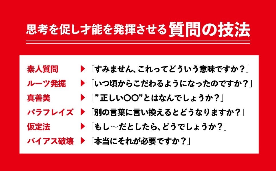 こだわりを深掘りする質問(フカボリモード)や、固定観念を揺さぶる質問(ユサブリモード)など、問いの組み合わせ方や質問技法などの実践ツールが充実しています。素人質問、ルーツ発掘、パラフレイズ、仮定法、バイアス破壊など、すぐに活用できる具体的な質問技法を紹介しています。