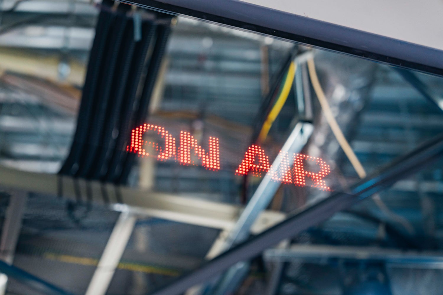 通路に面したスタジオ外壁には、デジタルサイネージを採用しています。同時に5つの映像が投影でき、スタジオ内の様子をカメラを通じで外部に放映することができます。