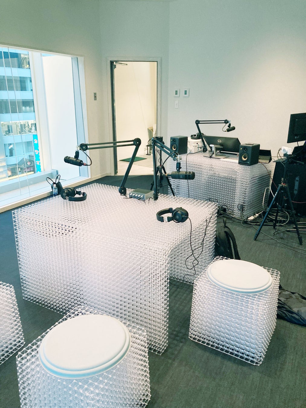 床面はダークなジーンズ素材で経年を楽しめるように、壁面は塗りっぱなしのような仕上げにして傷がついても目立たない仕様に、収録に使用する机や椅子などの家具は株式会社MagnaRectaと提携し、PET樹脂を独自の3Dプリント技術を使って構造物にするソリューション、「130(ワンサーティー)」で製作しています。130の持つ「修理可能」「再素材化可能」という特徴によって、「壊れたから廃棄して買い替える」というプロダクトサイクルではない新たな価値観を、このスタジオから提示していきます。