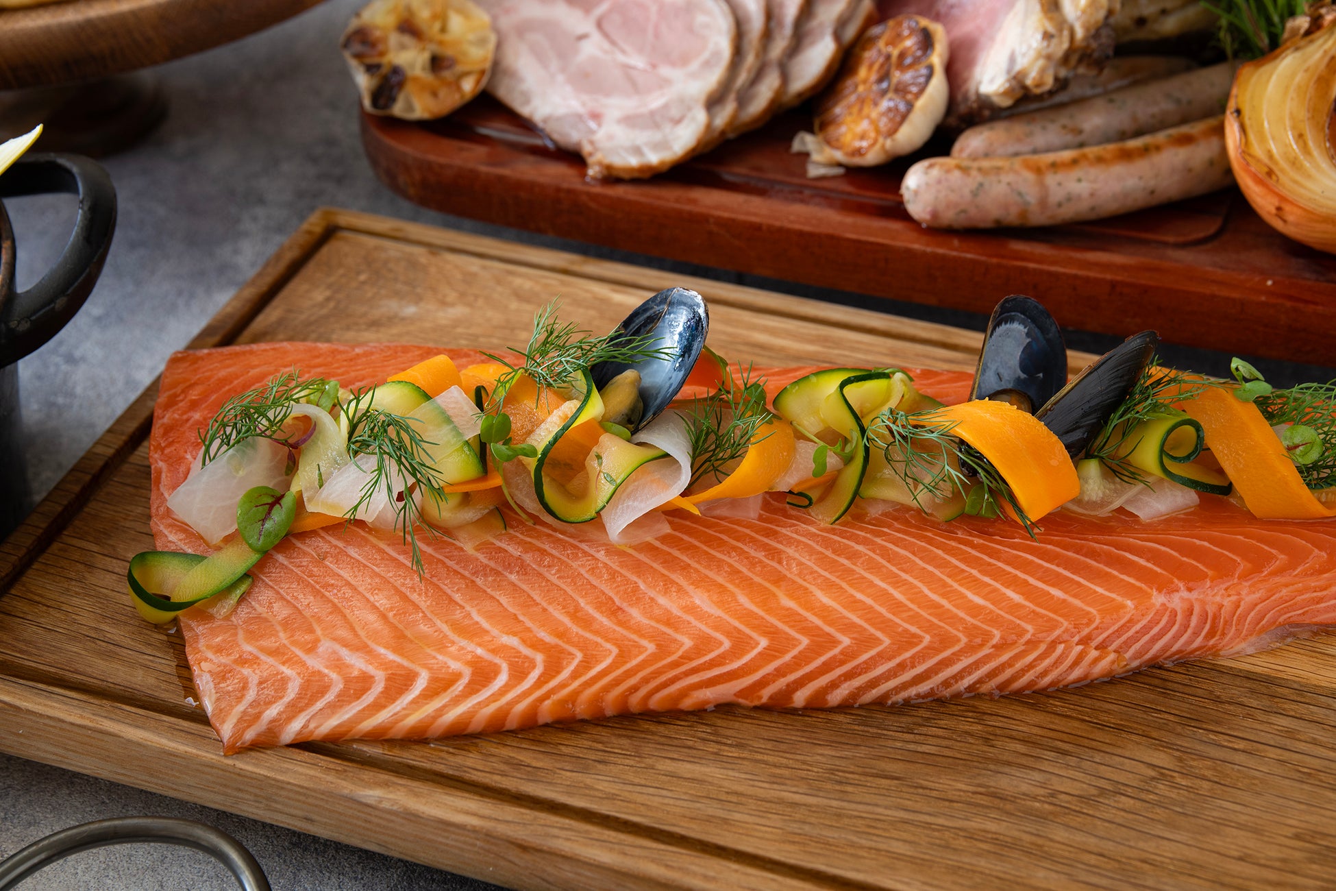 人気のローストビーフやにぎり寿司、窯焼きピッツァなど、約60種類ものバラエティー豊かなメニューが並ぶ自慢のブッフェとアラカルト料理をお楽しみいただけます。