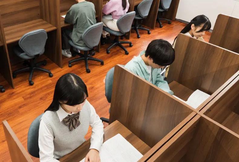 パーテーションで仕切られた自習室を完備し、落ち着いて勉強に集中できる環境を整えています。受講していない教科でも先生に質問することができるので、授業の予習・復習や学校の課題がはかどります。新年度体験講座の期間中、いつでも利用できます。
