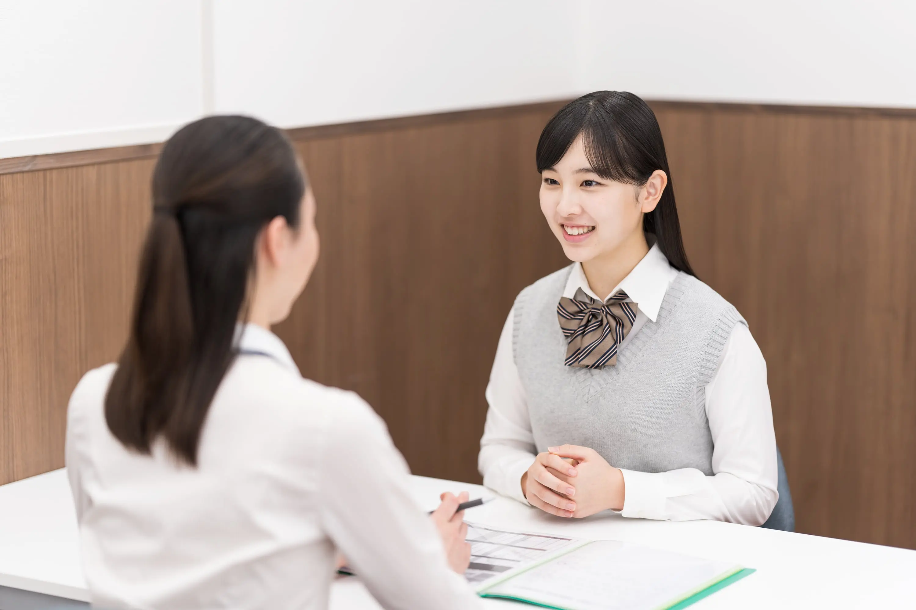 大学受験ナビオでは、学習や進路の相談ができる面談を定期的に実施しています。新年度体験講座の受講前には、苦手科目の克服や志望校合格に必要な学習法など、一人ひとりに合わせて必要な授業や学習プランを提案。受講後には振り返りの面談を行います。