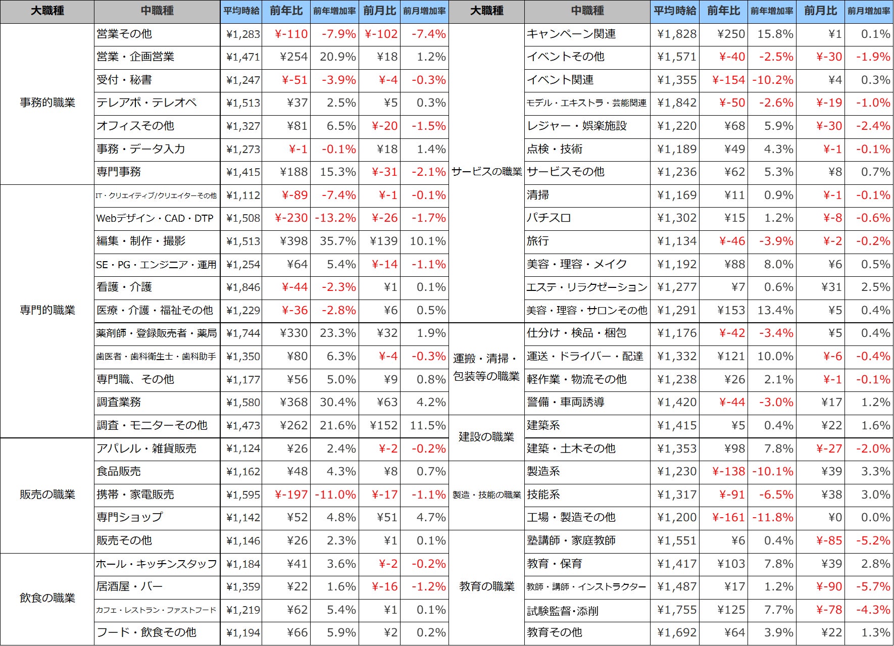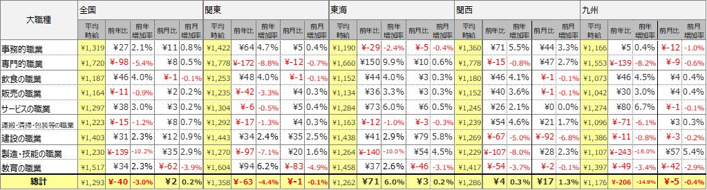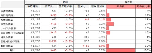 事務的職業は1,319円(前年比27円増、前月比11円増)、専門的職業は1,720円(前年比98円減、前月比8円増)、飲食の職業は1,187円(前年比46円増、前月比1円減)、販売の職業は1,164円(前年比11円減、前月比2円増)、サービスの職業は1,297円(前年比38円増、前月比3円増)、運搬・清掃・包装等の職業は1,223円(前年比15円減、前月比8円増)、建設の職業は1,403円(前年比31円増、前月比12円増)、製造・技能の職業は1,230円(前年比139円減、前月比35円増)、教育の職業は1,517円(前年比34円増、前月比62円減)となりました。