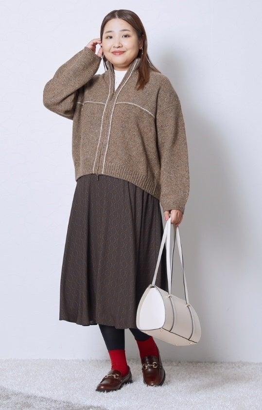 カラーネップが表情豊かなニットブルゾン。アウターとしてお出かけに、真冬はコートインにと、ロングシーズン活躍するアイテムです。同系色の柄スカートを合わせ、落ち着きのある大人カジュアルスタイルに。小物で取り入れた差し色がさりげないポイントです。
