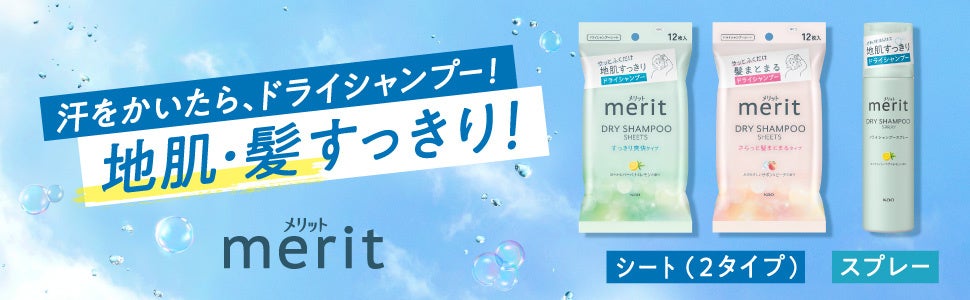 メリットは、2022年4月、水なしで使え、外出先で入浴できなくても地肌・髪をすっきりリフレッシュできるアイテムとして、シートとスプレーをラインアップした『メリット デイプラス ドライシャンプー』を発売しました。スポーツや仕事で沢山汗をかいた時、キャンプ・登山などのアウトドアや旅行時、防災・緊急時など、入浴ができない日のあらゆるシーンで、頭髪の清潔を守る習慣を提案してまいりました。特に、日中いつでも汗のべたつきをさっとオフできる使用感が好評で、「汗ばんでリフレッシュしたい時、本当にさっぱりしてシャンプーで洗ったような爽快感があってよかった」、「気持ちよく、爽やかな香りもして清涼感バッチリ」など、喜びの声をいただいています。
