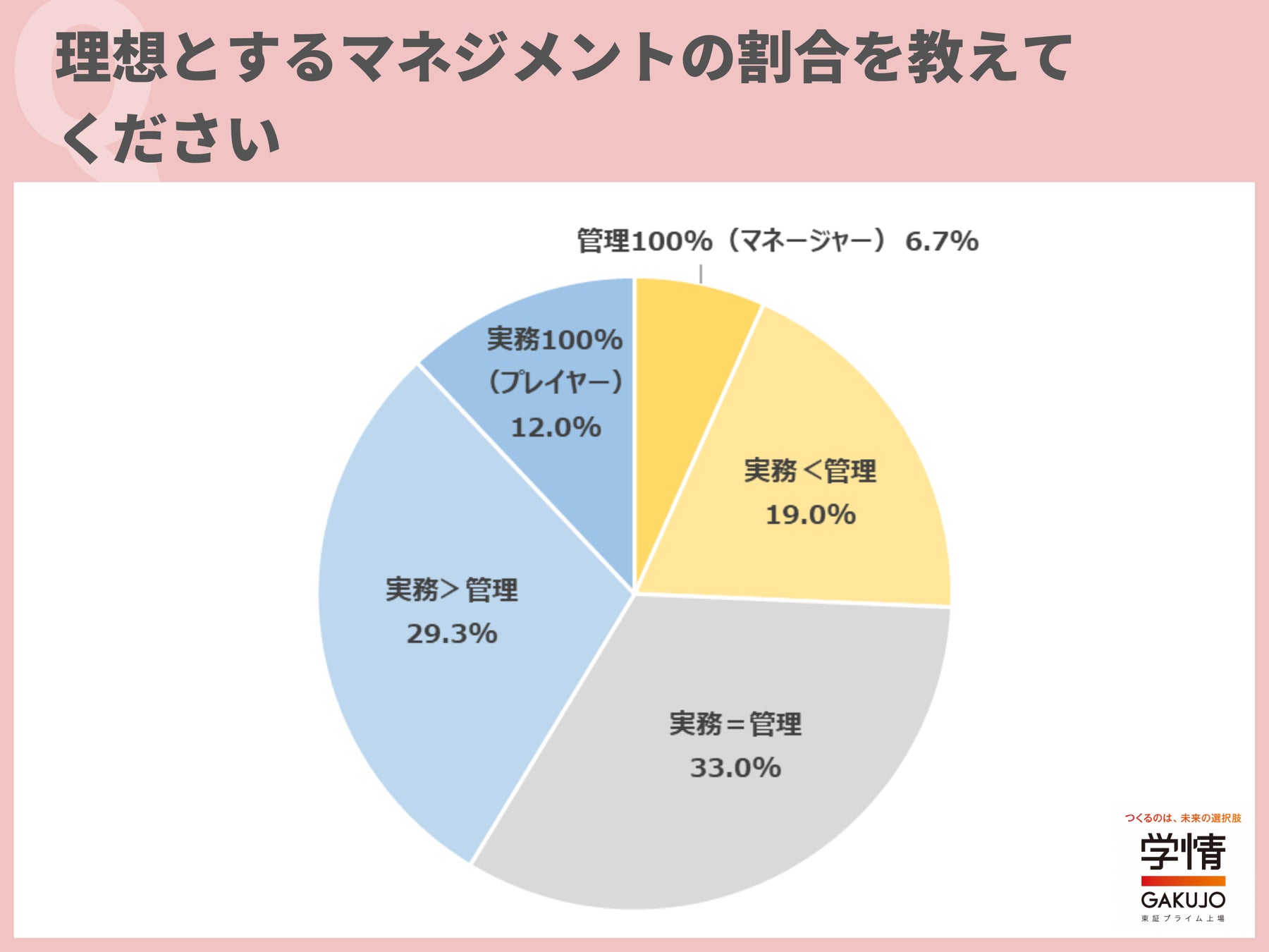 理想とする実務とマネジメントの割合を問う質問では、「実務=管理」が33.0%で最多。続いて、実務重視の「実務>管理」29.3%、管理重視の「実務<管理」19.0%、「実務100%(プレイヤー)」12.0%、「管理100%(マネージャー)」6.7%の順でした。管理より実務を担いたい人が4割を超えています。