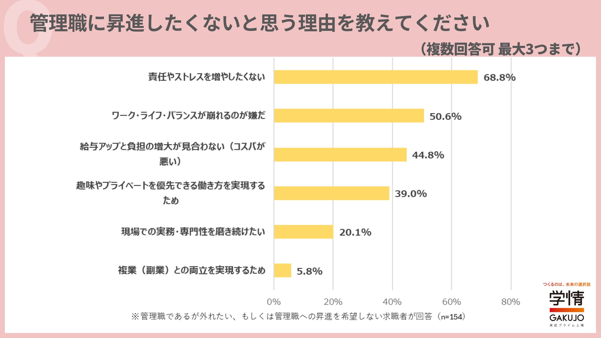 管理職に昇進したくない人にその理由を尋ねると(3つまで選択)、「責任やストレスを増やしたくない」が68.8%と7割近くを占めました。次いで、「ワーク・ライフ・バランスが崩れるのが嫌だ」50.6%、「給与アップと負担の増大が見合わない(コスパが悪い)」44.8%、「趣味やプライベートを優先できる働き方を実現するため」39.0%が並び、私生活重視を理由にあげる人が多くいました。
