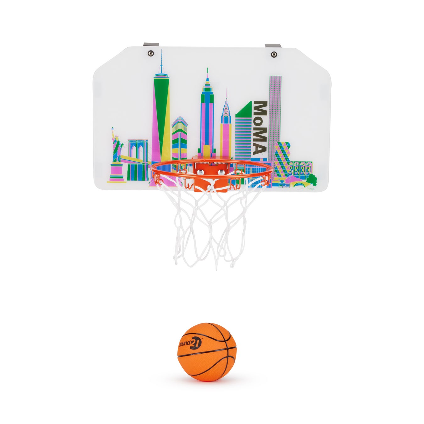 バスケットボールのプレーやMoMAを彷彿とさせるニューヨークシティのスカイラインを、自宅やオフィスで堪能できるミニバスケットゴールです。バックボードには、イギリス人デザイナーのアレクサンドラ・パルモウスキーの作品があしらわれており、ドアにかけたり、庭に出したりと、どこでも自宅にバスケットコートを作ることができます。