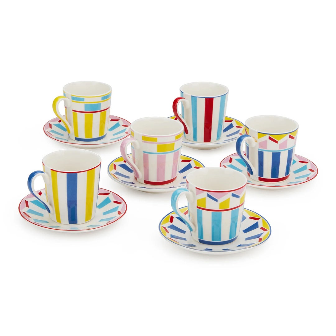 1876年創業、伝統あるイタリアのブランドがデザインしたエスプレッソカップ & ソーサーセットです。色、ストライプ、幾何学的な形がミックスされたデザインは、ゲストを楽しませ、毎日の食卓に喜びをもたらします。鮮やかな色彩と繊細な色彩のシンフォニーを奏で、線と図形が調和しています。