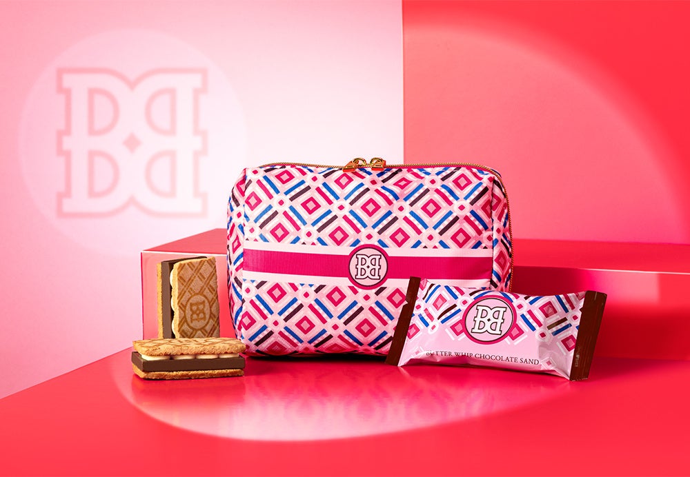 バターホイップショコラサンドの可愛らしいパッケージデザインが、オリジナルポーチになりました。ガバッと開いて中が見えやすく、仕切りがあるのも嬉しいポイント。乾燥対策で小物が増える冬の季節に、便利なこと間違いなしです!