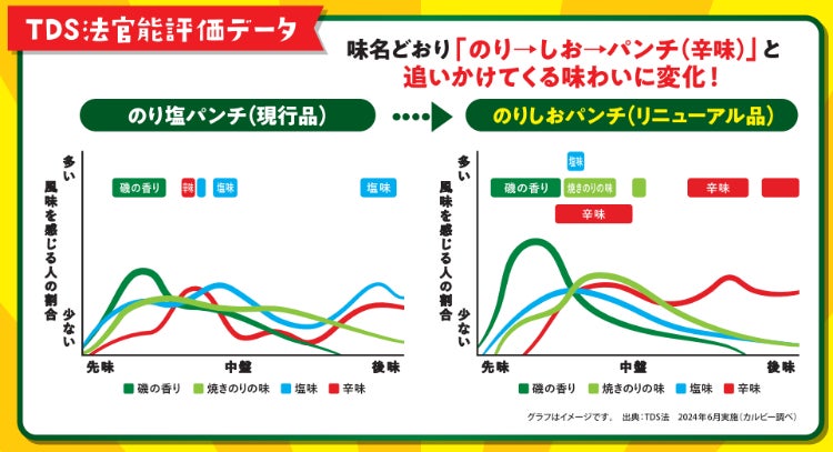 カルビーでは、これまで地域限定商品を多数展開してきました。今回リニューアルする「のりしおパンチ」は、2012年4月に東北・関東・中部エリアで登場。当時“のりしおフレーバー”の人気が上昇し、特に京浜・関東地区での販売量が多かったことから発売が決まりました。全国で発売している「のりしお」に比べて濃い目の味付けが特長で、「青のり」「あおさ」に加え「焼きのり※」を使用することで風味豊かな味わいを実現しています。