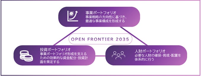本ビジョン実現に向けて、「事業ポートフォリオ」「投資ポートフォリオ」「人財ポートフォリオ」を三位一体で推進し、経営資源を効率的かつ柔軟に活用することで、持続可能な成長と企業価値向上の実現を目指します。各事業における「成長性」と「収益性」の両面の取り組みにより、主要財務目標の達成を目指します。
