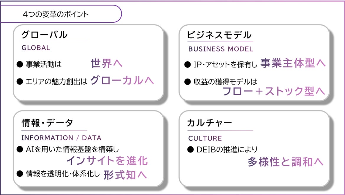 JTBグループは「新」交流時代のフロンティア企業として、創立から114年にわたり培ってきた洞察力と専門性を生かし、交流を創造する力を最大限に活用して、社会課題の解決とツーリズム産業全体の持続可能な未来の創造に貢献していきます。ありたい姿に向けた変革のポイントは4つ、 「グローバル」「ビジネスモデル」「情報・データ」「カルチャー」です。