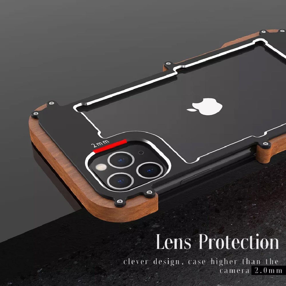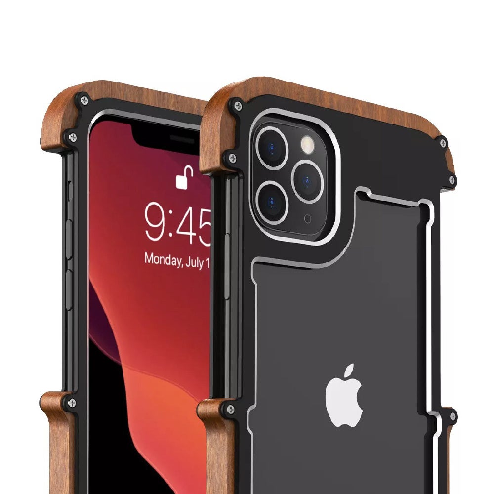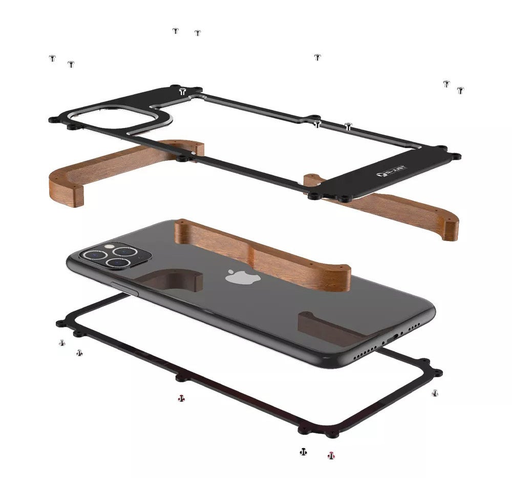 基盤となる枠にはアルミニウム、iPhoneを持った時に主に触れる枠部分はアイアンウッドを採用。