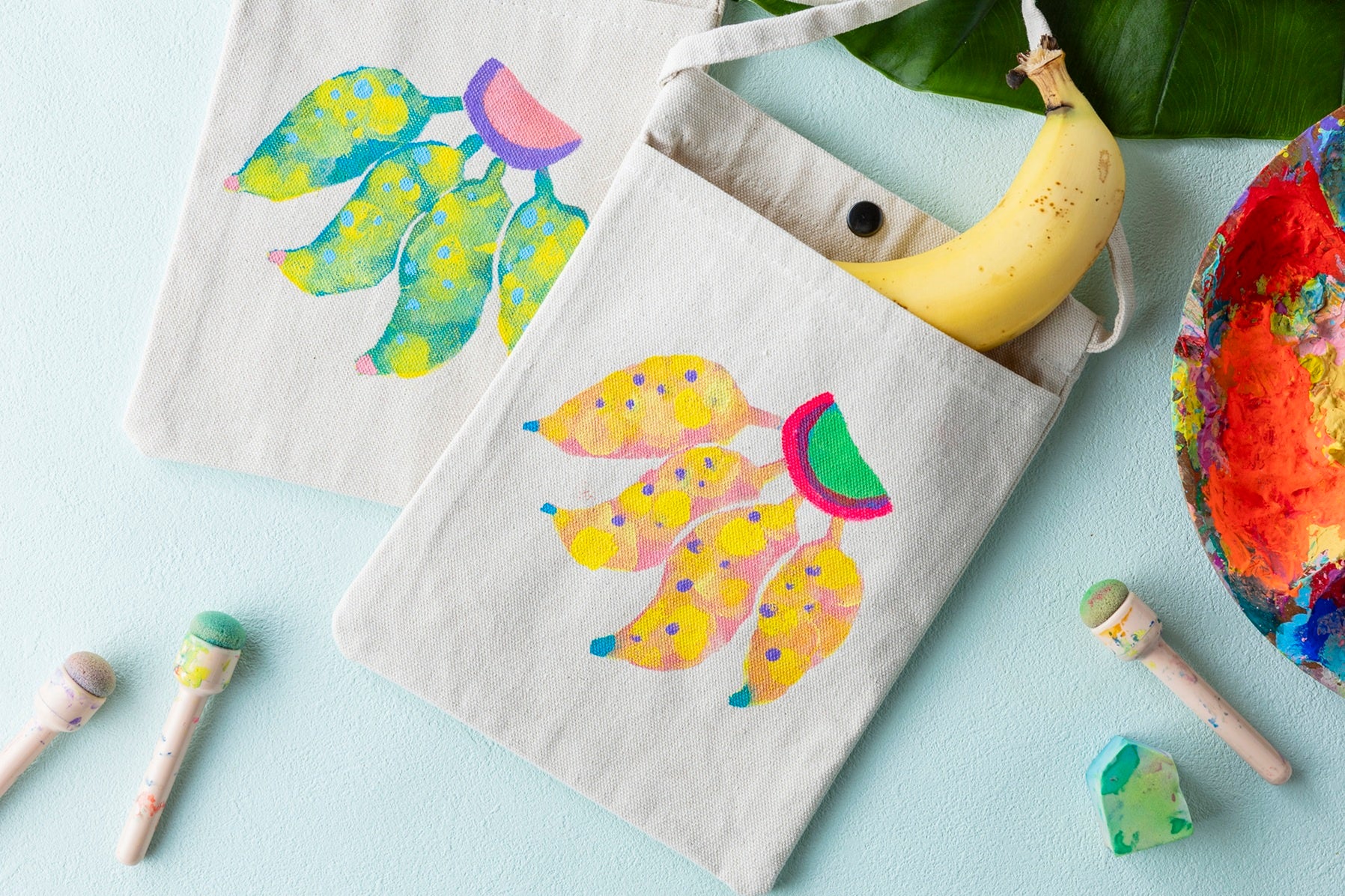 今年で5年目となる「まーさんトロピカルフェア」。スタートからキービジュアルを担当する沖縄在住アーティストMEGU WAZOUSKIのワークショップを行います。お子様にもフィットする小さなサコッシュに、作品の世界を映し出す色鮮やかな絵の具で島バナナを描きます。バナナを軸ごとディスプレイした「もぎって楽しむ、バナナスタンド」から、もぎたてのバナナを入れて完成です。