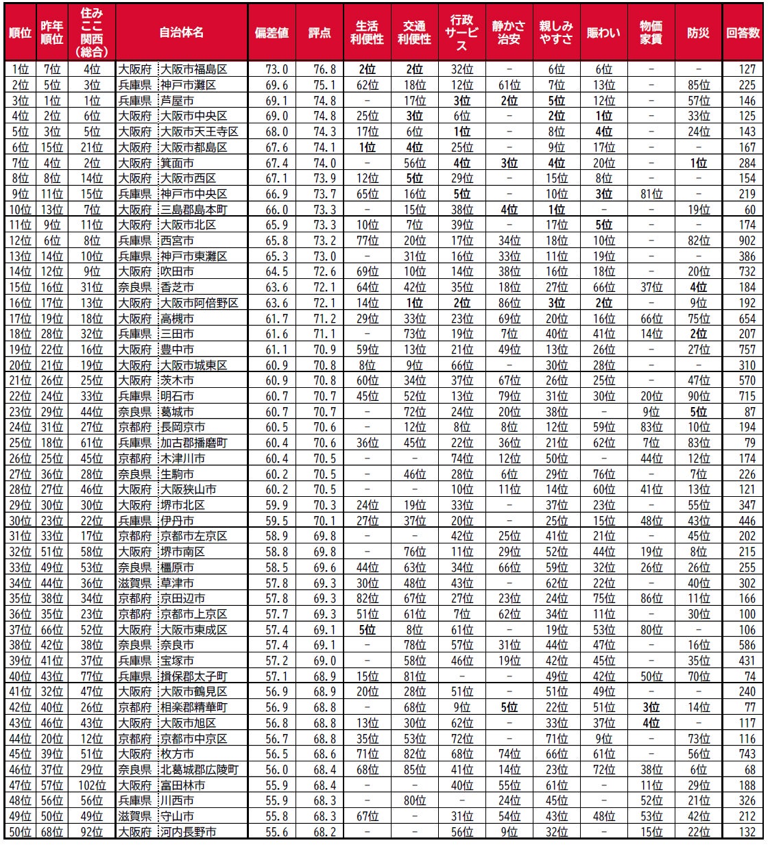 ※住みここ関西版(総合)の順位は、 2025年7月9日に発表した「街の住みここちランキング2025<関西版>」の順位を表記しています。