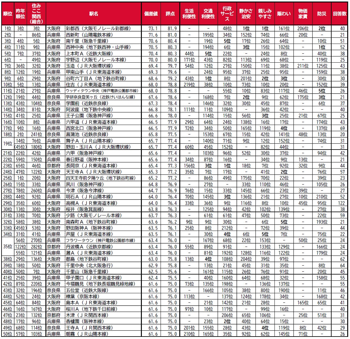 1位は、大阪府茨木市に位置する彩都西で、「住みここち<関西版>」では3位となっている駅です。2位は初登場の、兵庫県明石市に位置する西新町で、昨年は累計回答者数が20名未満でランキングの集計対象外でした。3位は、大阪府吹田市に位置する南千里で、昨年4位から一つ順位を上げました。その他トップ10内で初登場の駅は、6位の大阪府茨木市に位置する宇野辺で、昨年は累計回答者数が20名未満でランキングの集計対象外でした。また、7位の大阪府大阪市天王寺区に位置する玉造が、昨年36位から大きく順位を上げてトップ10入りしています。